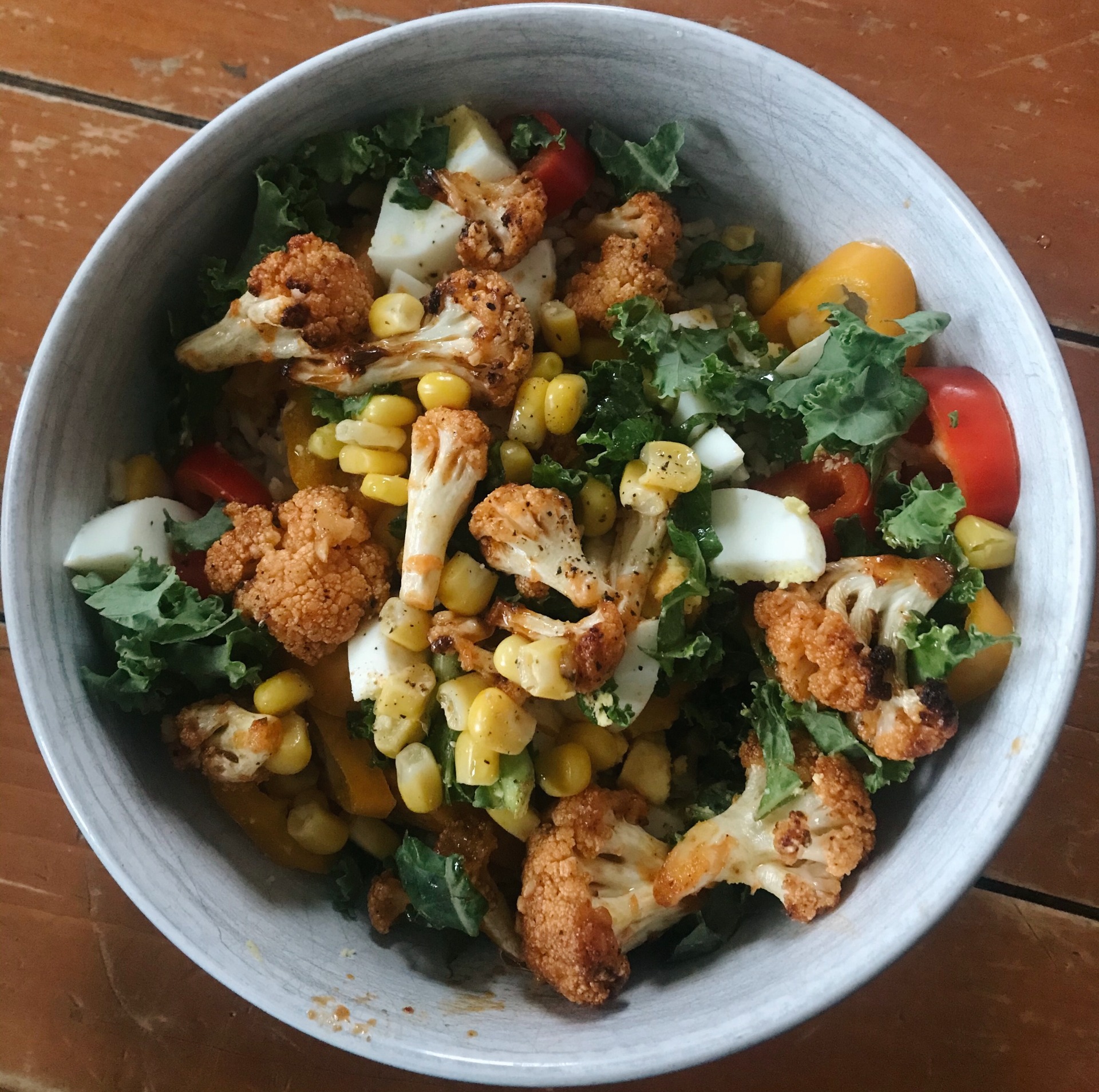 I recently went vegetarian and have always been a meat eater for my meals so I have been trying to find fun recipes to do, and this was worth the hype! In a bowl add cauliflower, 1/4 cup buffalo sauce, 1 tsp olive oil, 1 tsp garlic powder, 1/2 tsp salt, 1 tablespoon flour, and mix. Cook for 15 +minutes in air fryer depending on how cripsy you like it.( flip half way through) Then I added it on top of kale, peppers, rice ,corn and a hard boiled egg. ENJOY!!